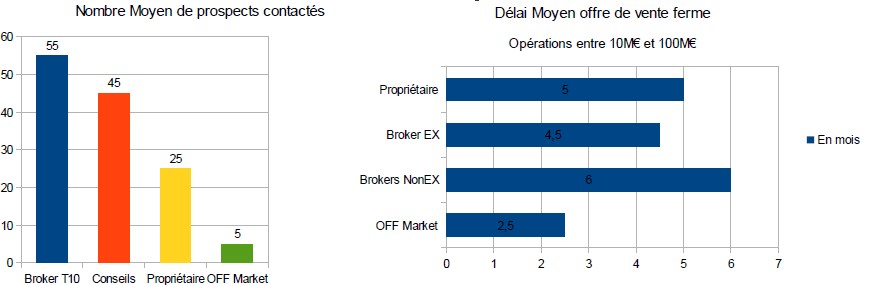 Lors d’un processus « off market », le temps est un élément déterminant pour la crédibilité de l’initiateur d’une telle opération. Aussi, comme d’autres conseils, il va procéder à un « screening » des transactions comparables, mais il va l’affiner à la manière d’un analyste, en essayant de retenir les deux caractéristiques nécessaires pour déterminer ses quatre ou cinq « cartes ». Ceux qui sont susceptibles de payer le meilleur prix, le « fair price » attendu, et traiter rapidement Ainsi, le fait de traiter moins d’offres, mais plus ciblées permet un gain de temps et un meilleur prix. Le délai moyen pour la remise d’une offre ferme dans un processus « off market » depuis la décision de vente est de deux mois et demi, contre quatre mois et demi dans le cas d’un mandat exclusif. De même, le nombre de prospects contactés est jusqu’à plus de dix fois moins important que lors d’un appel d’offres non ciblé. Ainsi, le « screening », couplé avec une analyse en amont pour déterminer un prix cible, permet l’avantage de l’enchère en terme de prix en réduisant le nombre d’acteurs.
